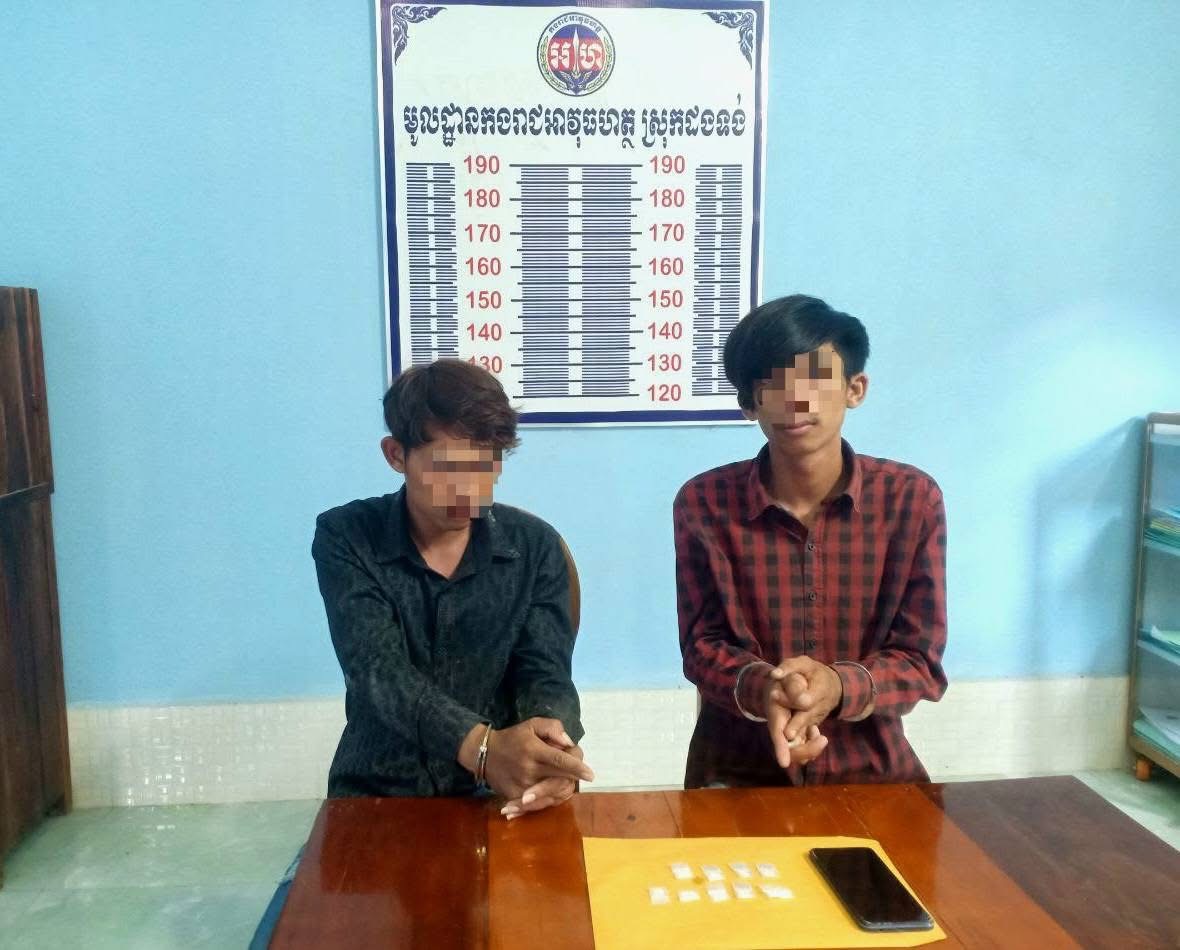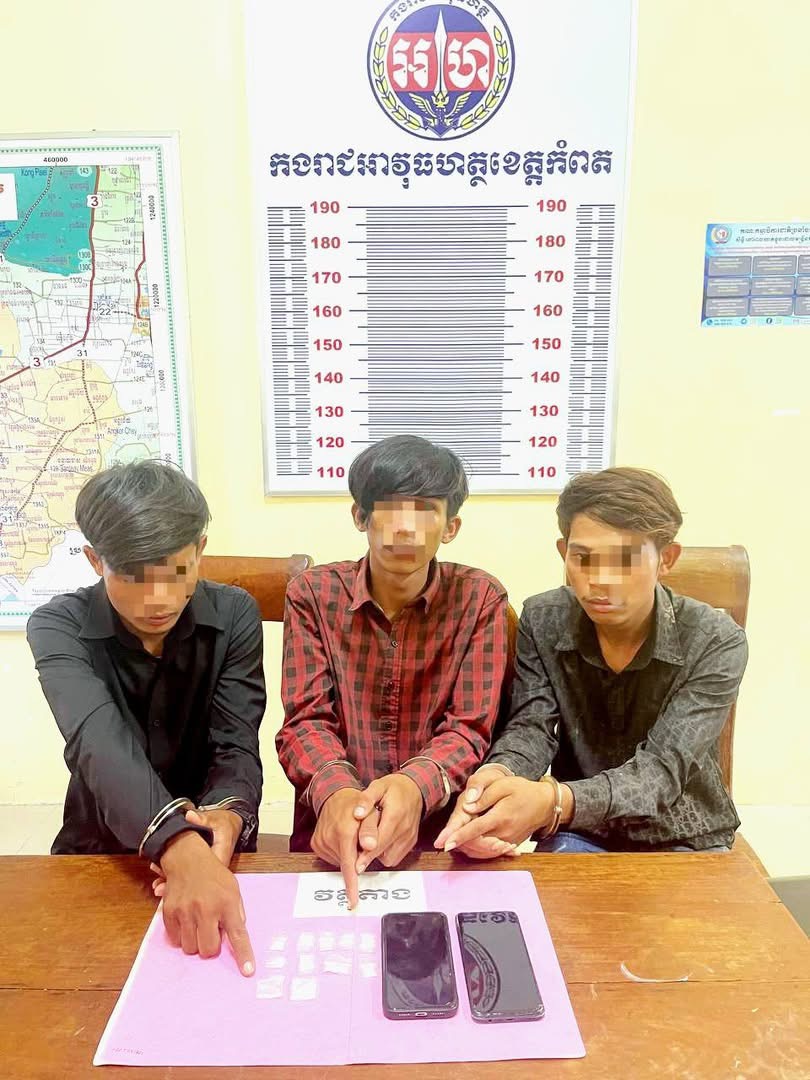 ២. ឈ្មោះ ទិត វិបុល ភេទប្រុស អាយុ ២១ឆ្នាំ មុខរបរមិនពិតប្រាកដ រស់នៅភូមិឃ្ជាយខាងលិច ឃុំដំណាក់សុក្រំ ស្រុកដងទង់ខេត្តកំពត (ជួញដូរគ្រឿងញៀន)។ វត្ថុតាងចាប់យករួមមាន៖ គ្រឿងញៀនចំនួន ០៩កញ្ចប់ តូច(ទម្ងន់៣.២៧ ក្រាម)ថ្លឹងទាំងសំបកថង់, ម៉ូតូម៉ាក់ហុងដា Beat ចំនួន ០១គ្រឿង ពណ៌ខ្មៅ គ្មានស្លាកលេខ, ទូរស័ព្ទម៉ាក OPPOចំនួន ០១គ្រឿង។ លុះមកដល់វេលាម៉ោង១៤និង០៥នាទី ថ្ងៃខែឆ្នាំដដែលកម្លាំងកងរាជអាវុធហត្ថ បានធ្វើការឃាត់ខ្លួនជនសង្ស័យ បាន០១នាក់ទៀត ស្ថិតនៅភូមិស្រែព្រៃឃុំវត្តអង្គខាងត្បូង ស្រុកបន្ទាយមាស ខេត្តកំពត ឈ្មោះ ប៊ុល ភារុន ភេទប្រុស អាយុ ២១ឆ្នាំ មុខរបរមិនពិតប្រាកដ រស់នៅភូមិខ្នារ ឃុំលាយបូរ ស្រុកត្រាំកក់ ខេត្ដតាកែវករណី(ជួញដូរគ្រឿងញៀន)។ វត្ថុតាងចាប់យករួមមាន៖ គ្រឿងញៀនចំនួន ០២កញ្ចប់តូច(ទម្ងន់០.៨៥ ក្រាម)ថ្លឹងទាំងសំបកថង់, ម៉ូតូម៉ាកហុងដាសង់ ពណ៌ស ១គ្រឿង, ទូរសព្ទម៉ាក iphoneចំនួន ០១គ្រឿង ពណ៌ស។បច្ចុប្បន្ន ជនសង្ស័យ និងវត្ថុតាងខាងលើត្រូវបានឃាត់ខ្លួនបណ្ដោះអាសន្ន នៅមន្ទីរស្រាវជ្រាវ និងបង្ក្រាបបទល្មើសដើម្បីអនុវត្តតាមនីតិវិធី៕